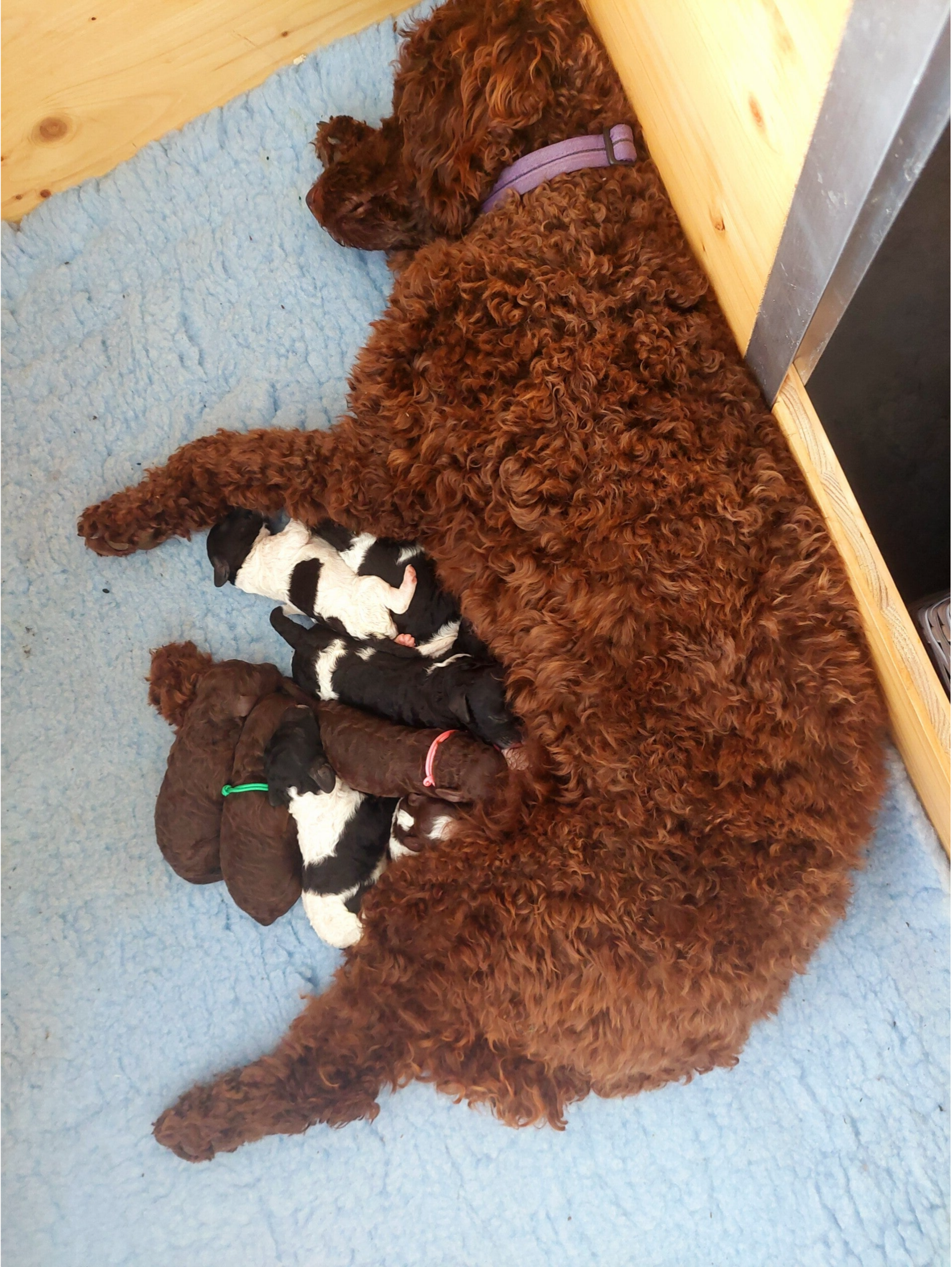 Heute Mittwoch 26.11. sind die Lockenköpfli schon 2 Wochen alt. Ich bin mit der Entwicklung der Welpen sehr zufrieden und staune wie viel sie schon gewachsen sind. Vor allem der grosse schwarz/weisse Rüde sticht hervor. Die Mädchen 2xbraun 1xharlekin können ihren Platz an der Milchbar gut verteidigen.